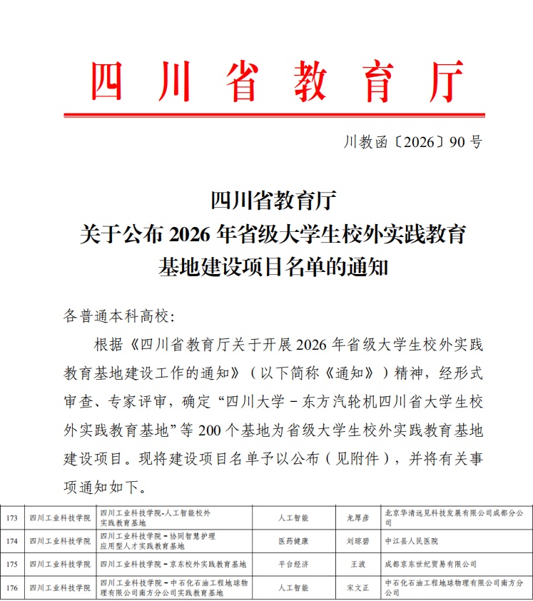 近日,四川省教育厅正式下发《关于公布2026年省级大学生校外实践教育基地建设项目名单的通知》(川教函〔2026〕90号),经形式审查、专家评审及公示等环节,四川工业科技学院共有四个校外实践教育基地成功入选2026年省级大学生校外实践教育基地建设项目。