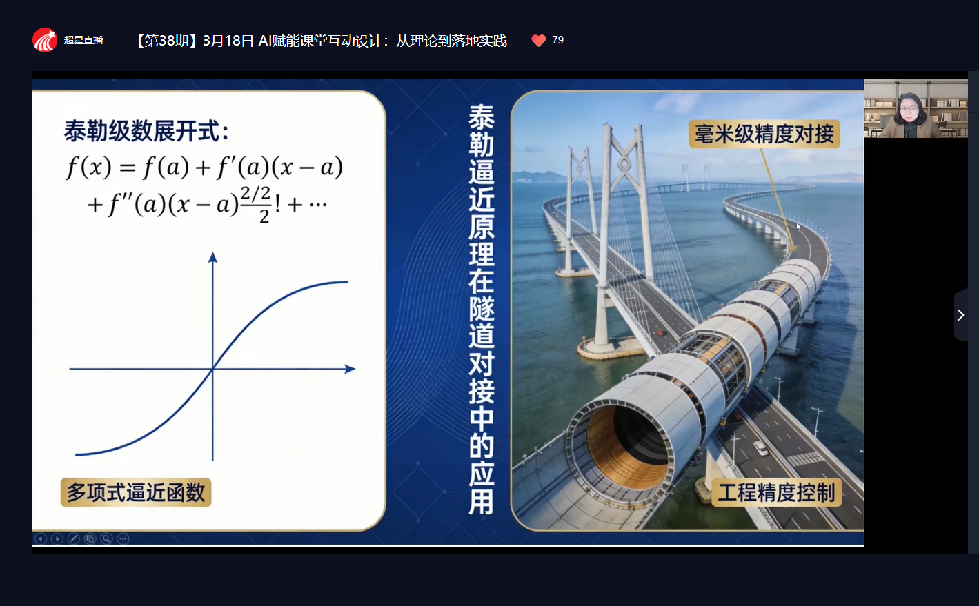 在实践案例分享环节,李凤副教授以数学公共基础课程为例,展示了AI技术在教学中的创新应用。她曾将港珠澳大桥这一超级工程引入高等数学教学,生动讲述深海沉管对接误差控制在2.5毫米背后的数学原理与工匠精神;还以高速铁路运行安全为例,详细阐述轨道曲率变化对行驶稳定性和安全性的影响机理。这些案例不仅展示了数学理论的实用性,更将知识传授与家国情怀培育有机融合,体现了AI赋能背景下“知识传授与价值引领”双育人的教学理念。