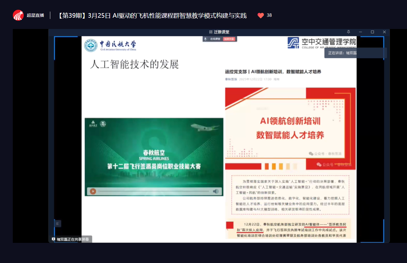 3月25日下午,学校教师教学发展中心组织全校无课教师参加超星“师享汇”第三十九期线上直播讲堂。本次活动特邀中国民航大学褚双磊副教授作题为“AI驱动的飞机性能课程群智慧教学模式构建与实践”的专题分享,吸引众多教师线上参与。