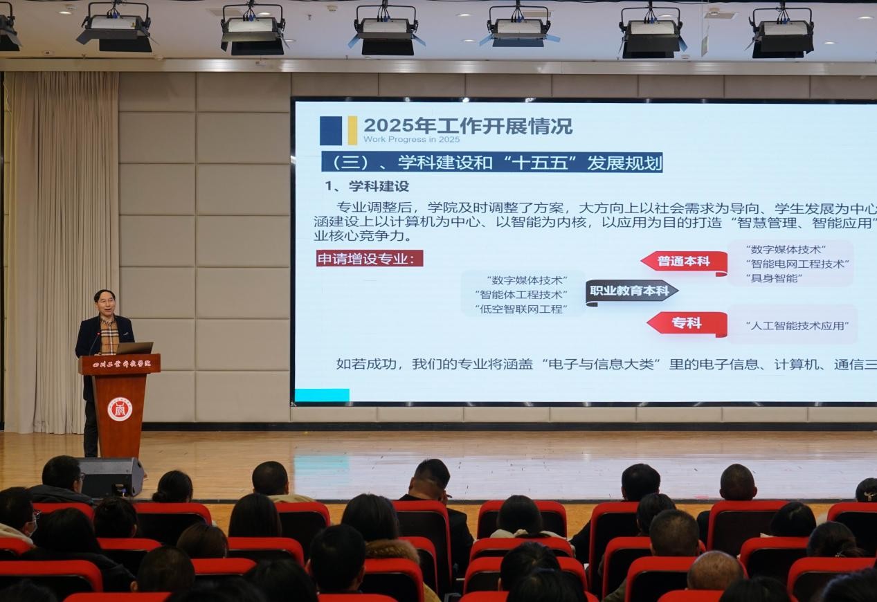 1月9日上午,智能制造与车辆工程学院在龑江C608教室召开2025年度总结暨处级干部述职大会。学校副校长张继华,教务处、科技处、人事处等职能部门代表应邀到会指导。学院全体教职工参加会议。