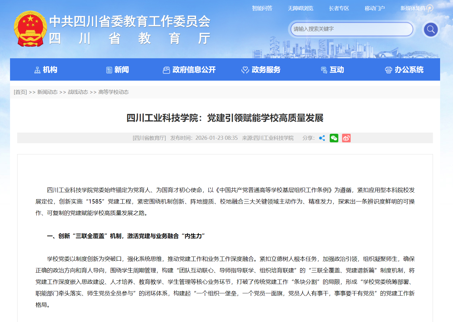 四川工业科技学院党委始终锚定为党育人、为国育才初心使命,以《中国共产党普通高等学校基层组织工作条例》为遵循,紧扣应用型本科院校发展定位,创新实施“1585”党建工程,紧密围绕机制创新、阵地提质、校地融合三大关键领域主动作为、精准发力,探索出一条辨识度鲜明的可操作、可复制的党建赋能学校高质量发展之路。