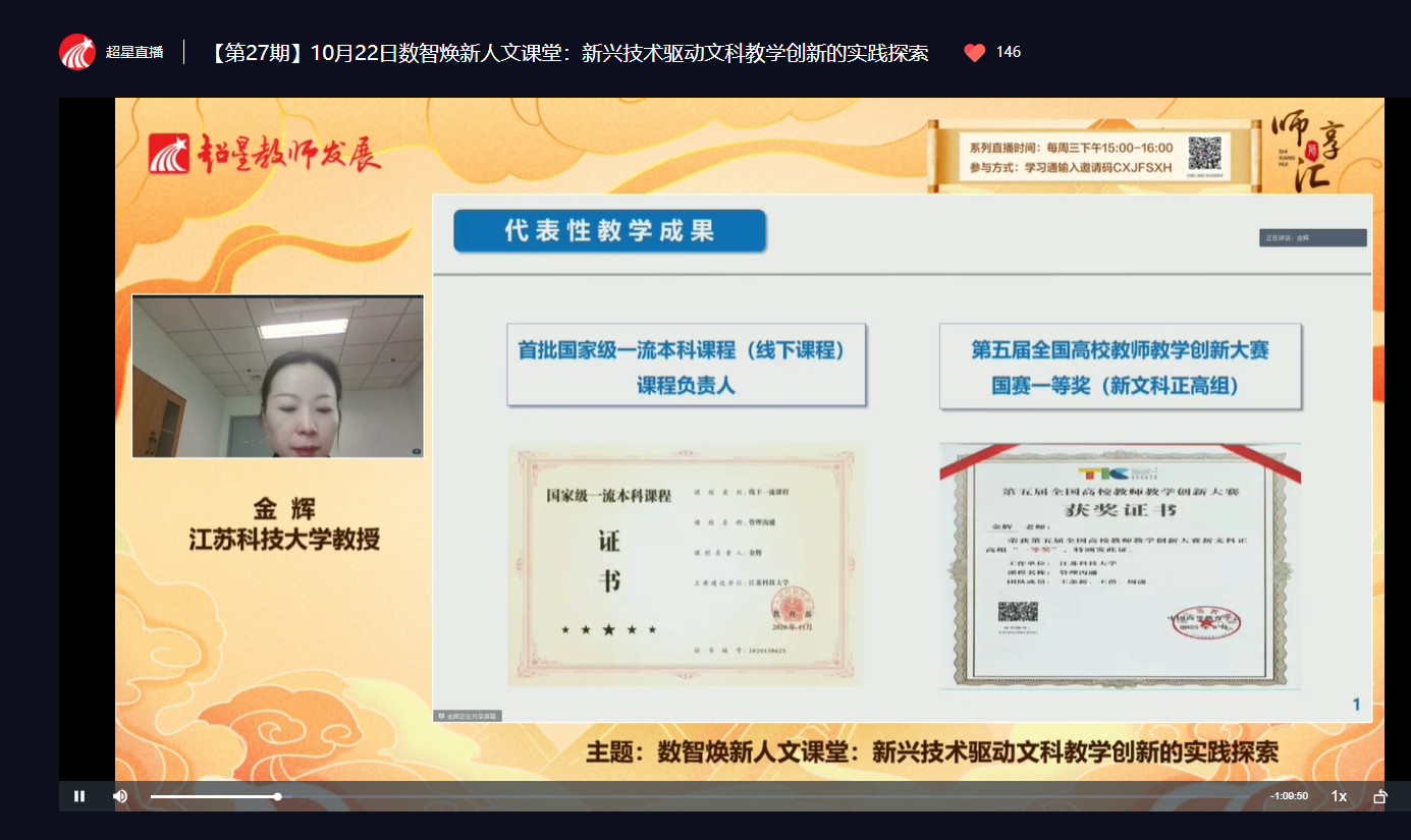 10月22日下午,学校教师教学发展中心组织全校无课教师参加超星“师享汇”第27期线上培训。江苏科技大学金辉教授应邀作《数智焕新人文课堂:新兴技术驱动文科教学创新的实践探索》专题讲座。