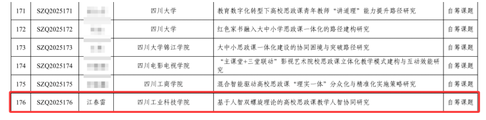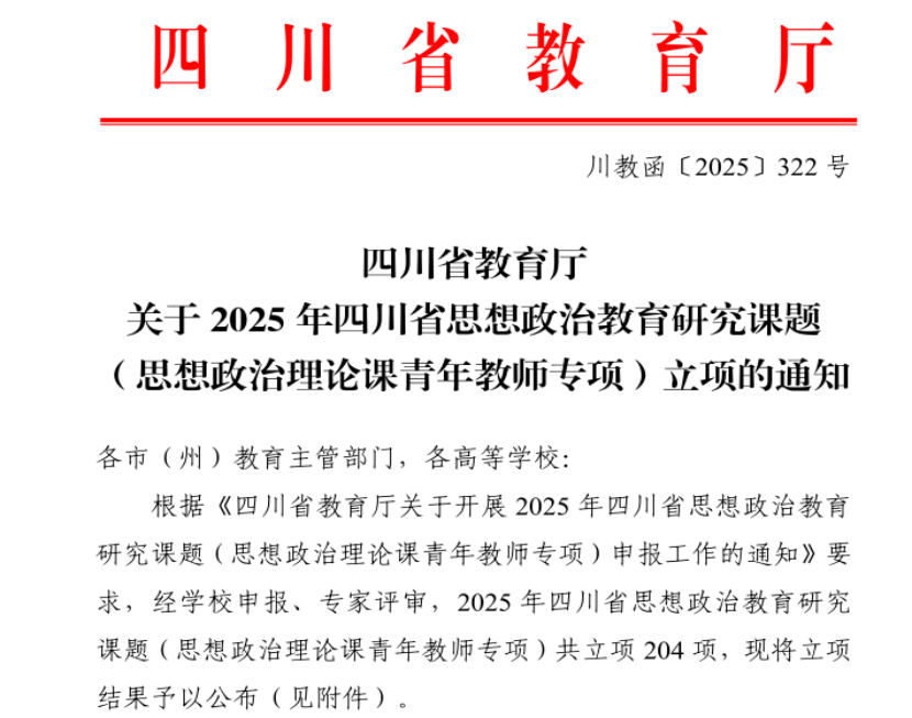 近日,四川省教育厅正式公布了2025年度四川省思想政治教育研究课题立项名单。马克思主义学院江春雷副教授申报的课题,获批“思想政治理论课青年教师专项”立项。