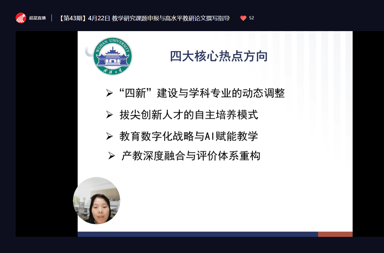 为进一步提升教师教学研究能力,推动教研成果凝练与产出,4月22日下午,学校教师教学发展中心组织全校无课教师参加了超星【师享汇】第四十三期线上直播讲堂。本次活动特邀武汉大学刘燕群教授作题为“教学研究课题申报与高水平教研论文撰写指导”的专题分享。