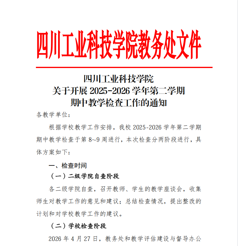 四川工业科技学院关于开展2025-2026学年第二学期期中教学检查工作的通知