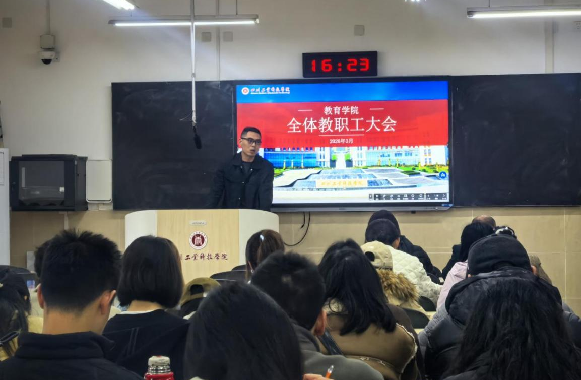 3月19日,教育学院在龑江D404教室召开全体教职工大会。学院院长蔡林、副院长熊清明分别就近期重点工作作出部署,全院教职工参加会议。