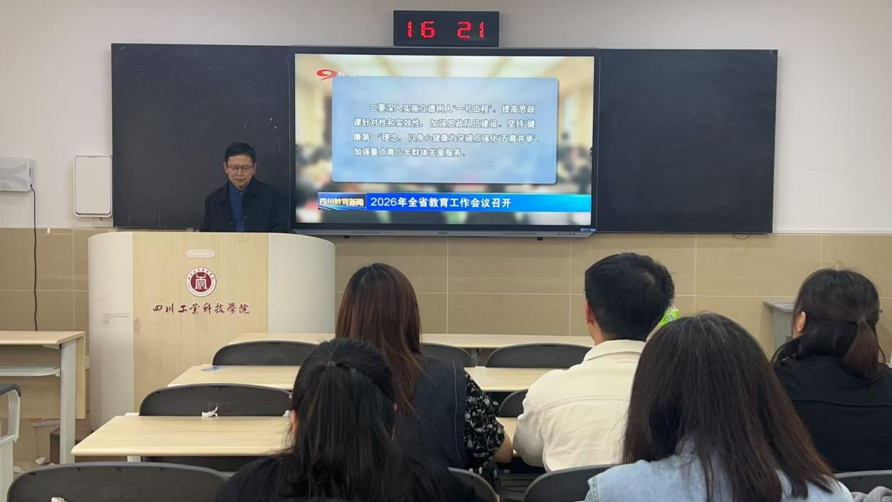 会议首先采用集中视频研学形式,组织全体教师系统学习两项上级会议精神。全体教师集中研学了教育部2026年相关部署要求,全面领会国家层面对新时代学生身心健康工作的总体安排。会议指出,要牢固树立健康第一的教育理念,统筹育人全过程,抓实心理健康教育、体质健康提升、育人环境优化等重点环节,全方位护航学生身心健康成长。同时,全体教师同步学习了四川省2026年全省教育工作会议精神,准确把握全省教育高质量发展工作部署,将立德树人根本任务落实到日常教学各环节。