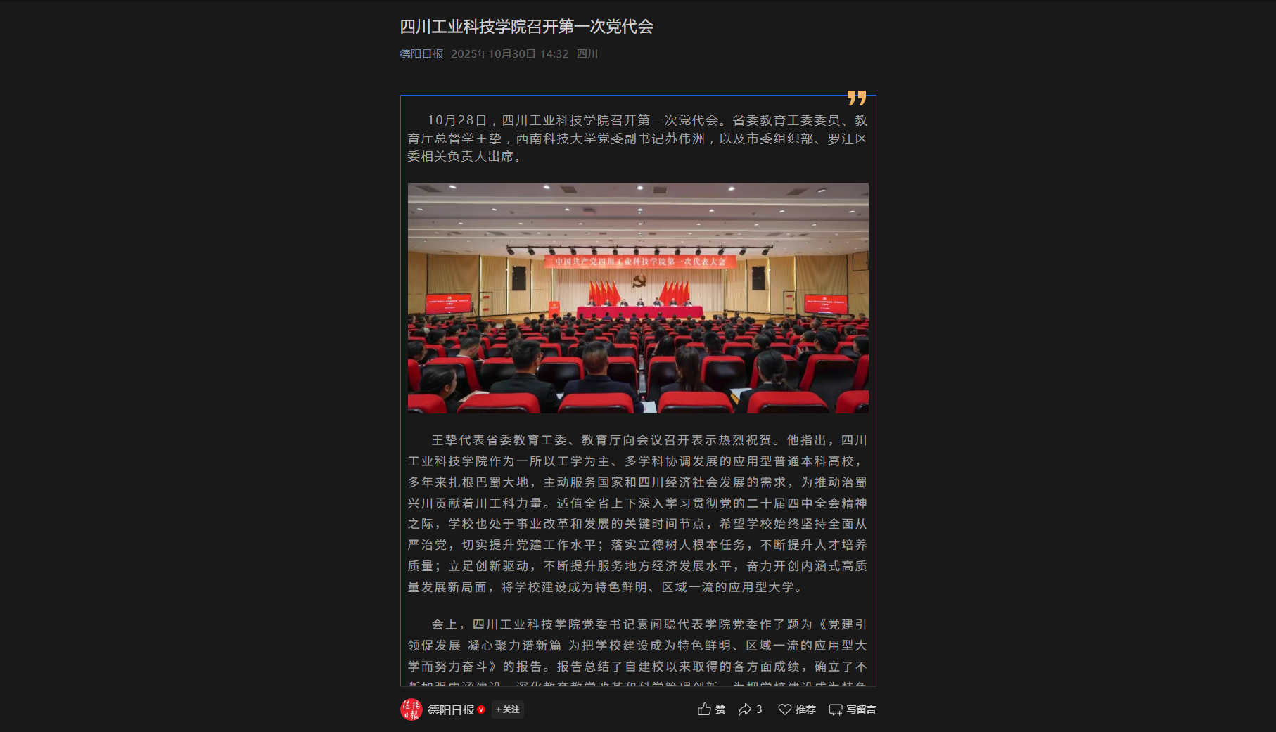 【凤凰新闻】四川工业科技学院第一次党代会召开 锚定区域一流应用型大学目标
