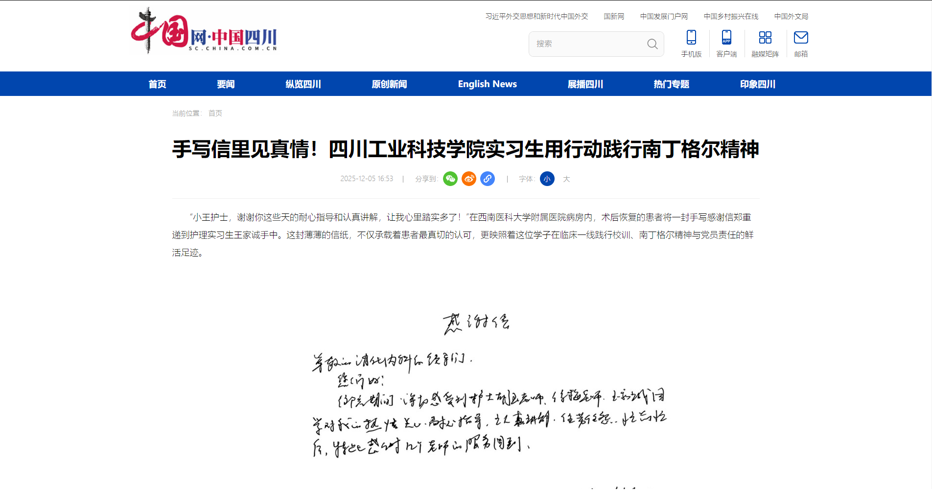 【中国网】手写信里见真情!四川工业科技学院实习生用行动践行南丁格尔精神