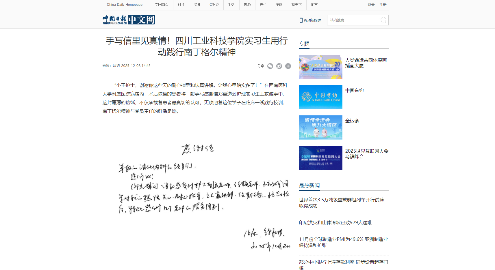 【中国日报】手写信里见真情!四川工业科技学院实习生用行动践行南丁格尔精神