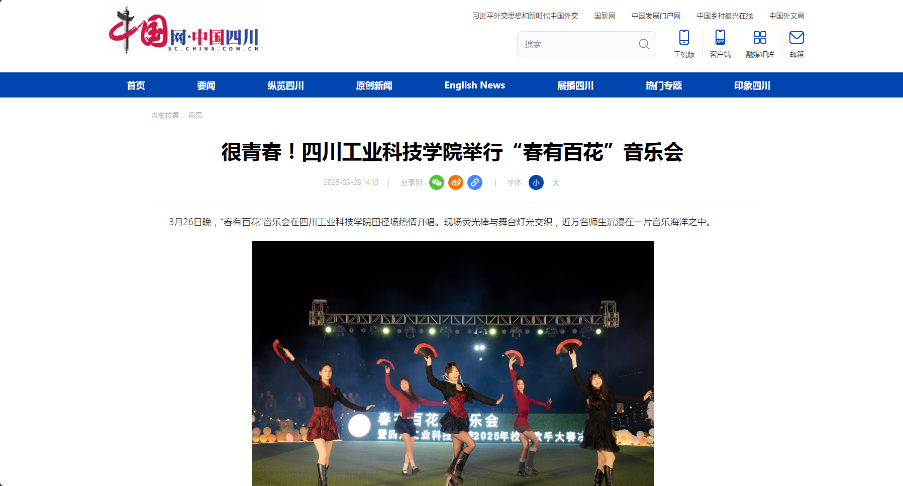 3月26日晚,“春有百花”音乐会在四川工业科技学院田径场热情开唱。现场荧光棒与舞台灯光交织,近万名师生沉浸在一片音乐海洋之中。
