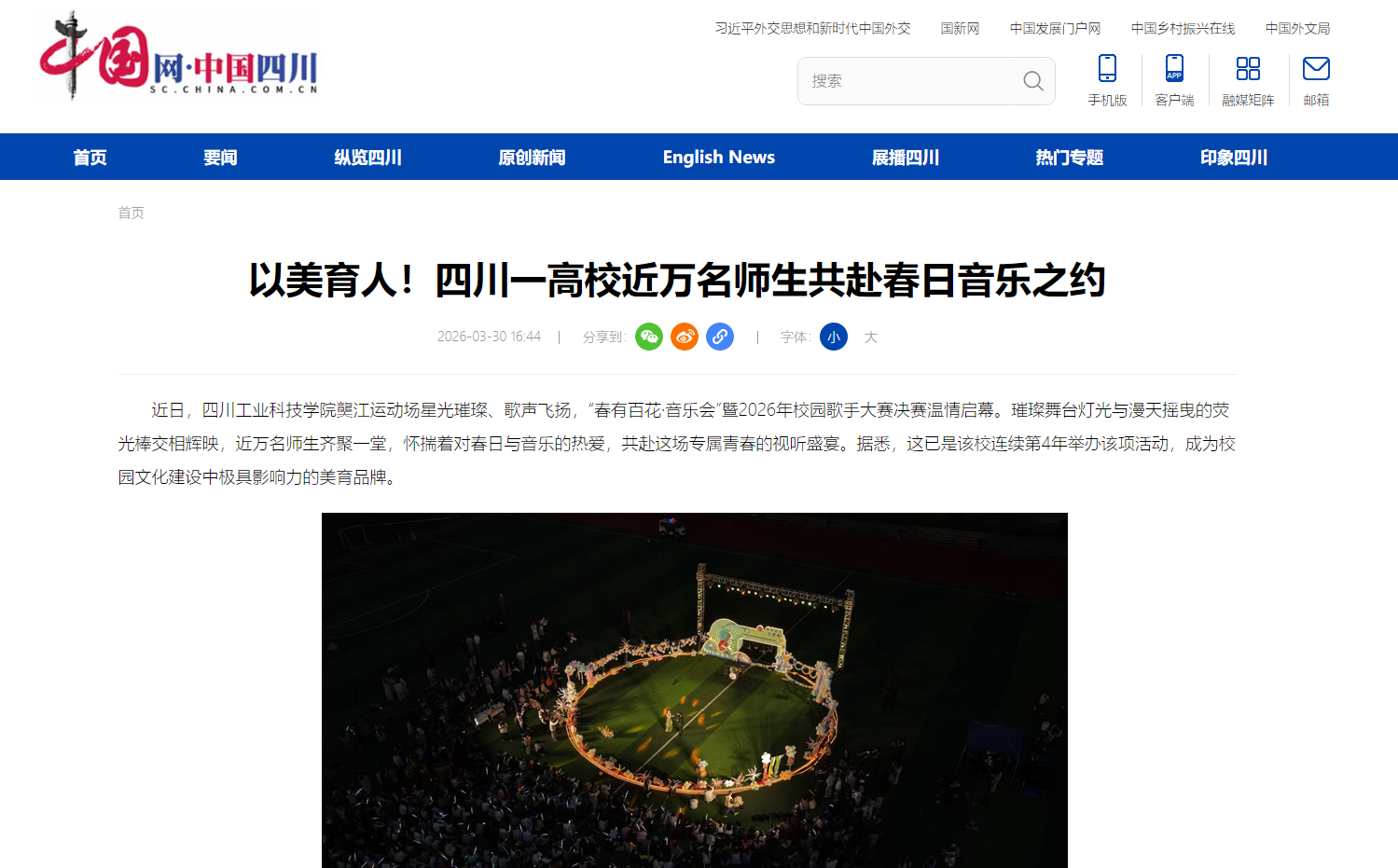 近日,四川工业科技学院龑江运动场星光璀璨、歌声飞扬,“春有百花·音乐会”暨2026年校园歌手大赛决赛温情启幕。璀璨舞台灯光与漫天摇曳的荧光棒交相辉映,近万名师生齐聚一堂,怀揣着对春日与音乐的热爱,共赴这场专属青春的视听盛宴。据悉,这已是该校连续第4年举办该项活动,成为校园文化建设中极具影响力的美育品牌。