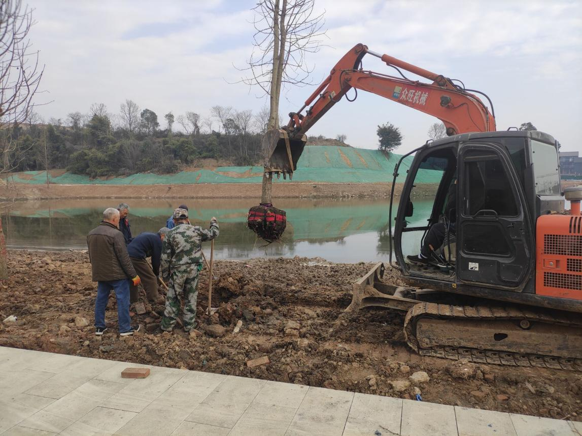 工作过程井然有序:施工前,通过对土壤贫瘠程度、板结程度及土壤的酸碱性进行分析,选用了150余株银杏树、100余株针楠树、60余株桂花树、30余株樱花树、50余株其余各种花树;施工中,通过挖掘机进行挖坑及吊运移植工作,工人们负责覆土压实工作,两者配合,有条不紊;施工后,对移植树木浇透水、施好肥,做好支撑工作,防止树木在根系扎稳之前偏倒。