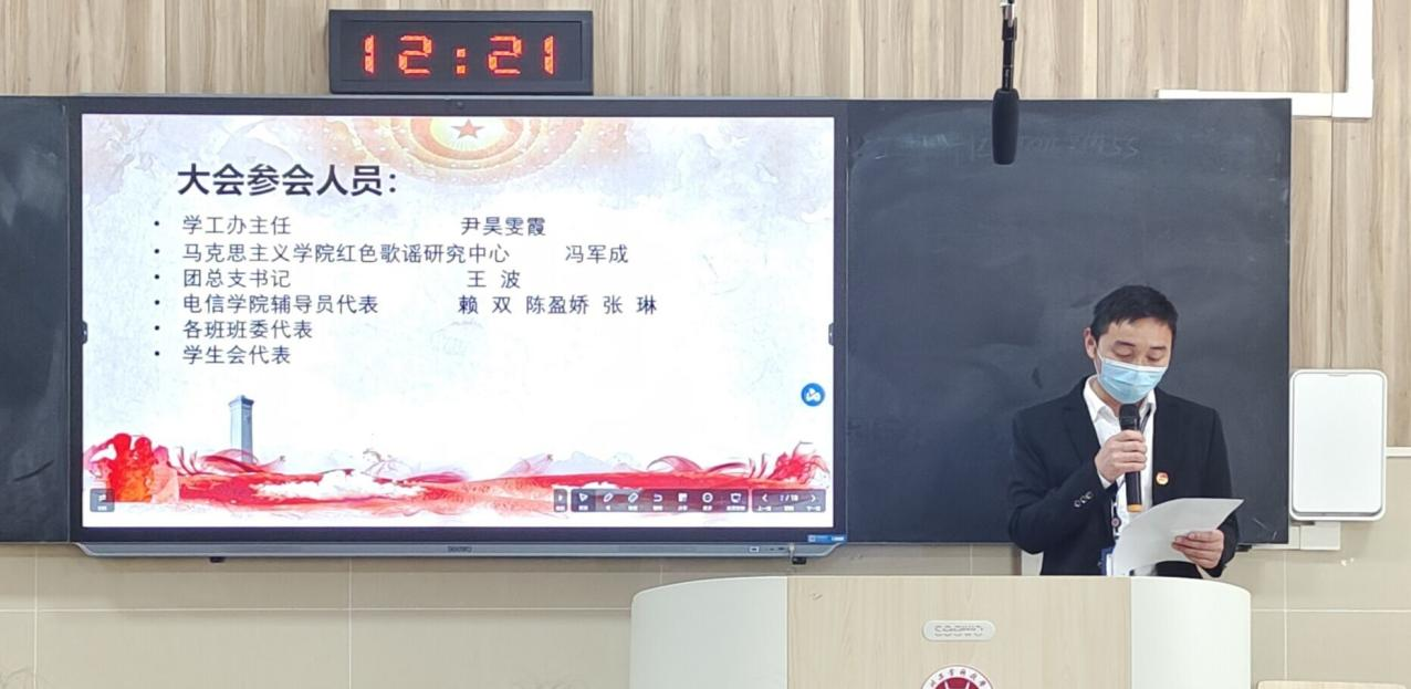 为加强学院团风、学风建设,提高同学们的思想政治意识,培养学院学生良好的日常行为习惯,3月10日中午,电子信息与计算机工程学院&食品学院组织学生干部在龑江学村B212教室进行学习,本次会议由团总支书记王波老师主持。