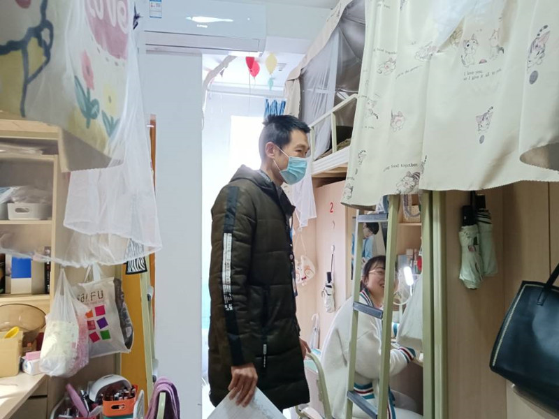 每到一个宿舍,张东国都会耐心地与学生们进行交流,就网络状况、教师上课情况、线上教学资源及学习效果、学生课余活动、防疫工作等情况进行询问。学生对疫情防控管理期间学院的工作表示充分理解。辅导员们亦仔细查看学生网课情况,询问同学们线上学习感受,激励学生要保持学习热情,强调在宿舍也要有良好的学习状态、一定自律、切勿懈怠,遇到问题及时请教老师解惑。