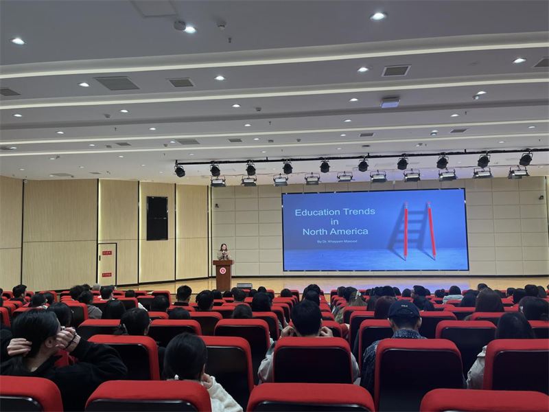 11月13日下午,由国际交流与合作部主办的“中外语言文化交流月”系列讲座第一场《北美高等教育》在龑江C区报告厅举行。活动邀请了加拿大AOL职业学院国际项目主任KHAYYAM MASOOD卡亚姆博士莅临讲座。国际交流与合作部全体教师和200余名学生共同聆听了讲座。讲座由杨宇婷老师主持。