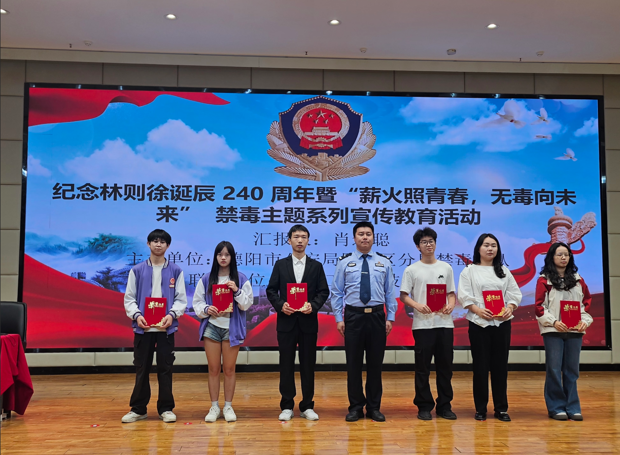 为纪念林则徐诞辰240周年,传承禁毒精神,筑牢校园禁毒防线。10月15日上午,学校联合德阳市公安局罗江区分局禁毒大队,在龑江综合楼C区报告厅开展“薪火照青春,无毒向未来”禁毒主题系列宣传教育活动。罗江区公安分局禁毒大队队长肖述聪受邀主讲,学校师生代表参与活动。