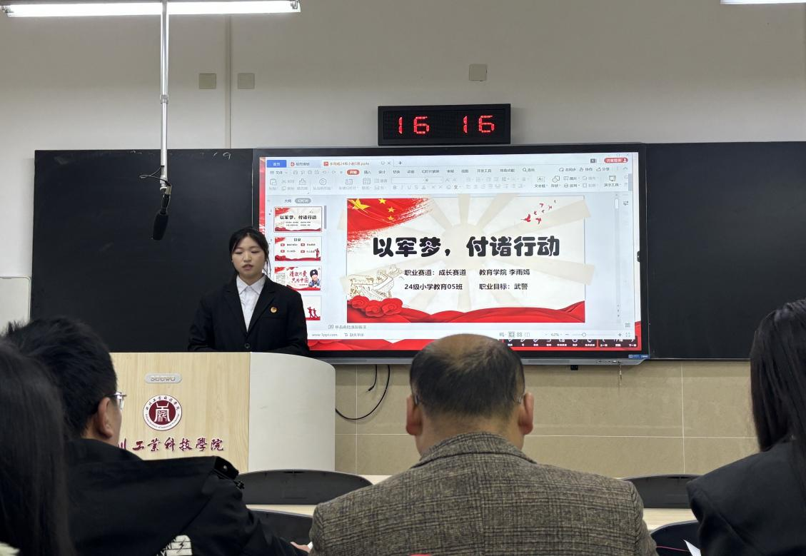 比赛过程中,选手们表现沉稳、思路清晰。就业赛道卢凤琳以“儿童成长引路人”为职业目标,系统分析行业现状,科学规划发展路径,并融入人工智能教育应用视角,体现出对教育领域前沿趋势的深入理解;成长赛道李雨嫣围绕“武警战士”职业方向,结合个人成长经历与家庭环境影响,生动阐述职业理想,展现出真挚的情感与坚定的信念。答辩环节中,评委就规划可行性、行业认知深度等关键问题与选手深入交流,选手们应对从容、对答如流,充分展现了教育学院学生扎实的专业基础与清晰的职业思考。