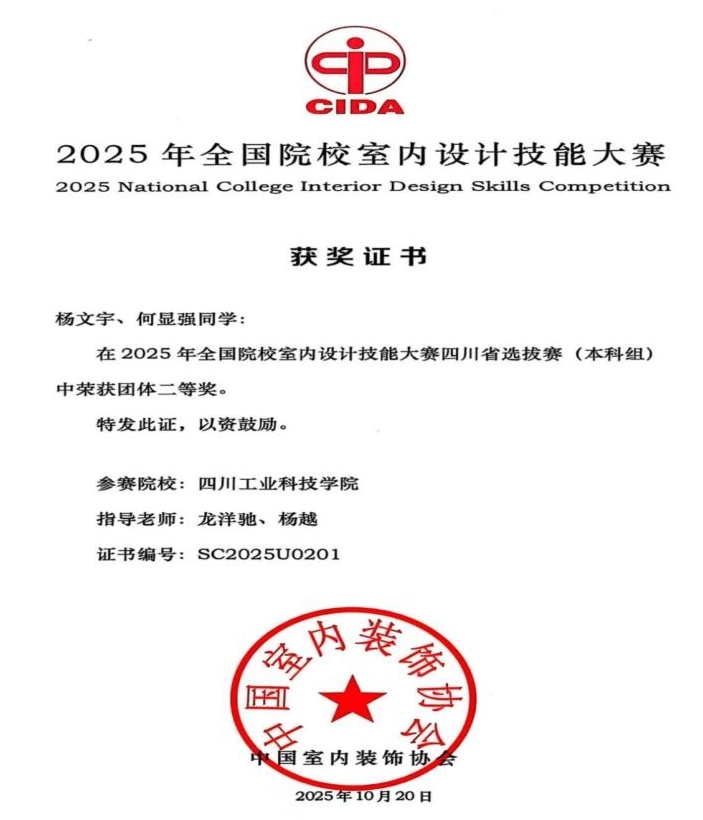 近日,2025年全国院校室内设计技能大赛全国总决赛结果出炉,学院参赛团队发挥出色,凭借创新的设计理念与扎实的专业功底,最终荣获“团体二等奖”,展现了学院在艺术设计领域的人才培养质量与非遗传承创新能力。