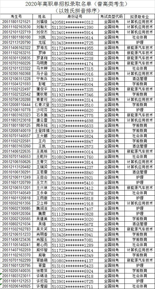 四川工业科技学院2020年高职单招考试拟录取名单公示